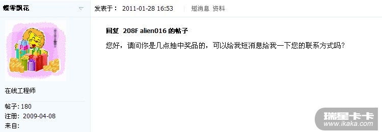 回复: 请问你是几点抽中奖品的,方便将你的联系方式站内短信发我吗?就我发帖之前啊,我怎么发给你啊?我找不到你的用户名……