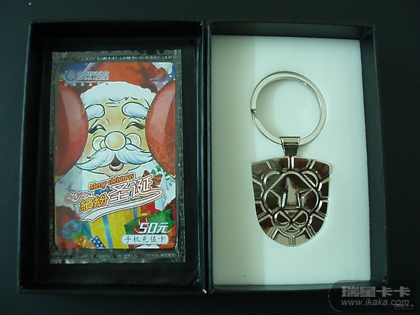 小盒子里放着50元移动充值卡和瑞星纯钢钥匙链: