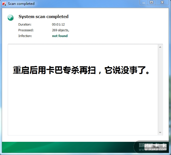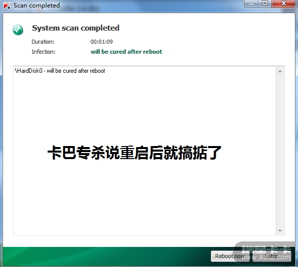 3、前面已经说过, RIS2011 完全被此毒绕过了。很多人相信卡巴的专杀TDSSKILLER可以搞掂此毒。它真能搞掂吗?看图: