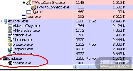 通过对病毒的监控 取得其主要行为有进程部分(AD) 病毒本体进程1.exe 运行一段时间后会启动 cmd。exe进程 如图(额 结束1.exe太快了 没来得及截图)
