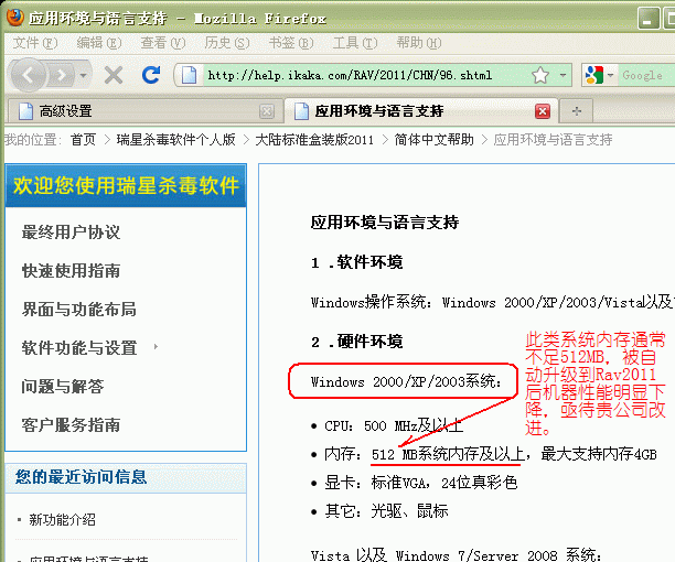 查阅 Rav2011 联机帮助(后附截图)发现 Rav2011 要求机器内存不得少于 512MB 。但联机升级时 Rising 的升级程序却无任何提示,升级过程也顺利完成,结果导致机器性能明显下降,影响用户工作。这不能不说是上述升级程序的设计欠考虑。