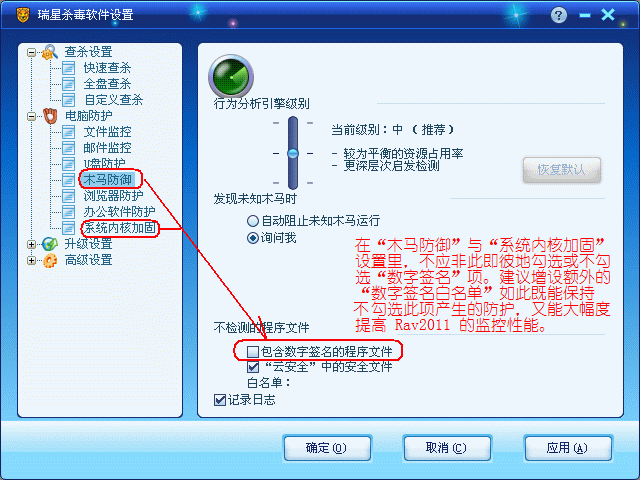 Rav2011 在 “木马防御” 与 “系统内核加固” 设置界面里,不应非此即彼地勾选或不勾选 “数字签名” 项以决定是否检测包含数字签名的文件(后附截图)。