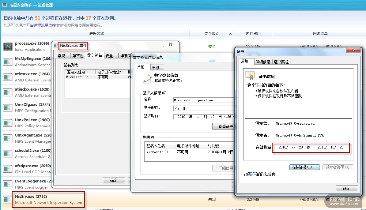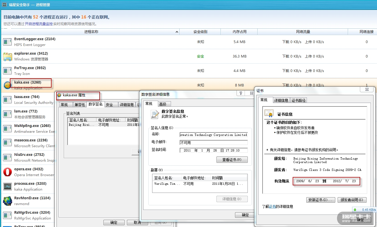 瑞星安全助手,这是瑞星自己的产品。kaka.exe进程的“安全级别”也显示为“未知