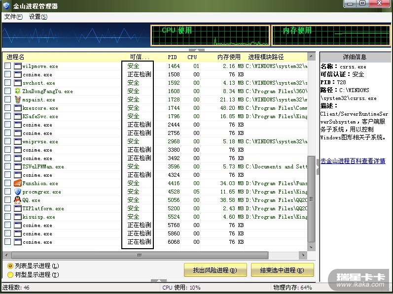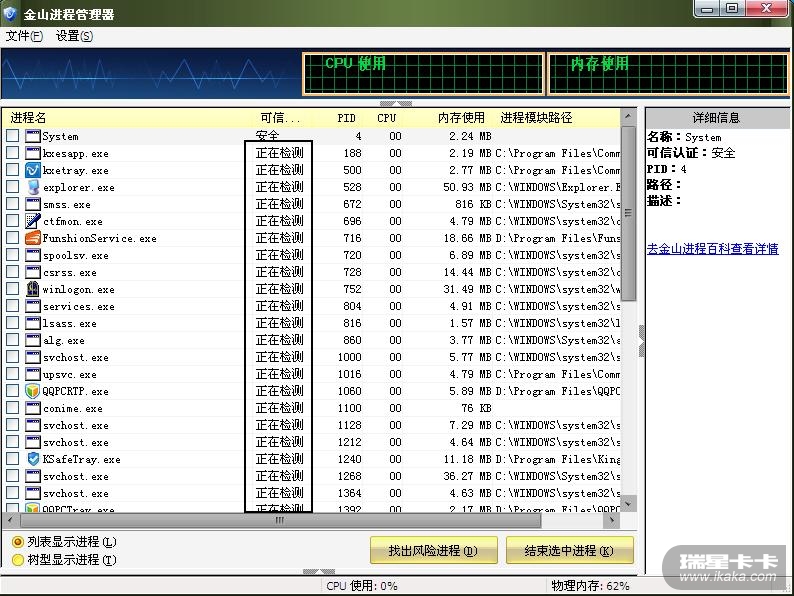 而 金山打开 其 进程管理后 ,所有的 程序的 安全信息 ,都被 自动查询!!!