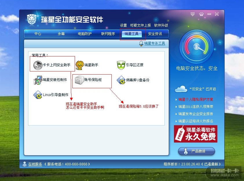 希望尽快把卡卡助手替换成瑞星安全助手,把保险也替换成5.0的,最好在安装时可以选择性的安装这些工具省的在重新下载。希望能采纳我意见。