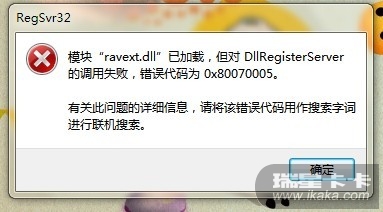 欲扫描一个文件,却突然发现右键菜单中的瑞星杀毒选项不在了(如图2)。后修复、重装(均删除用户配置、安装目录)仍未解决问题.随后手动加载 Ravext.dll,但系统显示“模块ravext.dll 已加载,但对DllRegisterserver的调用失败,错误代码为0x80070005”(如图1).