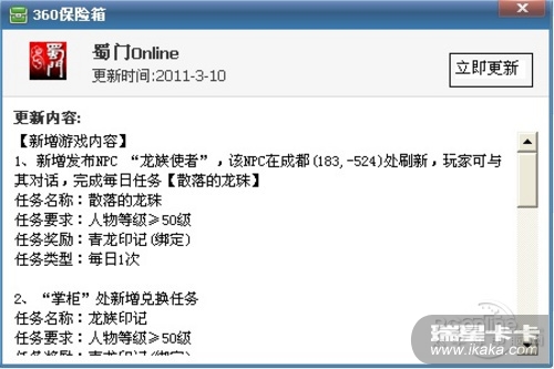 新版的360保险箱做了件非常贴心的设计:凡是玩家过去玩过的、但还没有卸载的网络游戏一旦出现了版本更新就会提示老玩家赶紧去尝鲜。笔者认为这个功能真是人性,笔者甚至觉得新版360保险箱的设计者肯定也如笔者一样是个痴迷网游的资深玩家,不然怎么可能会把资深玩家内心的那些想法设计出来呢?