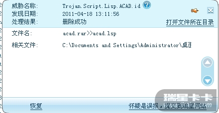 可在我的电脑上就是不能杀,不光我这一台。公司里凡是用瑞星的都不能查这个文件,病毒库都是最新。操作系统有XP、2000服务器版,也有2003企业版。