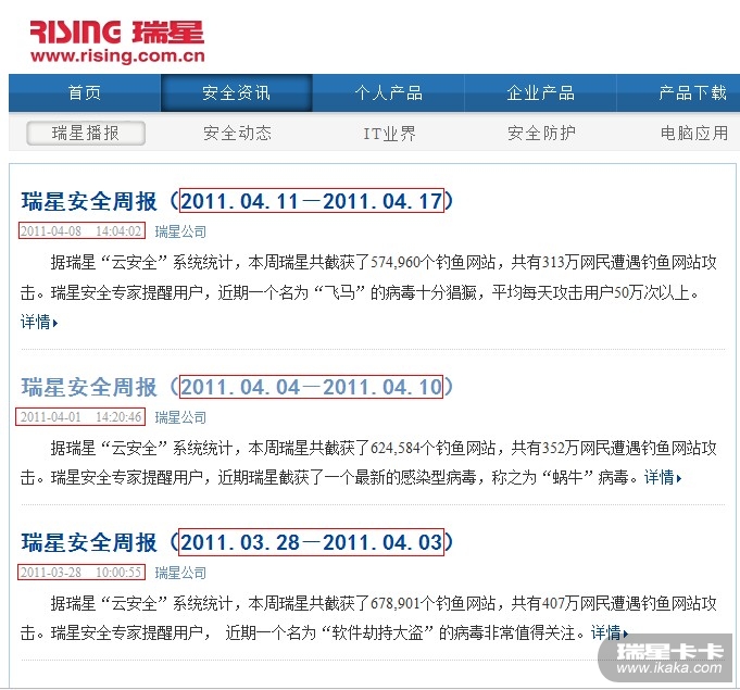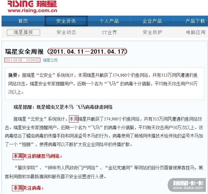 http://it.rising.com.cn/anti_virus/nextweek/2011-04-08/9192.html是瑞星安全周报(2011.04.11-2011.04.17),发出时间为:2011-04-08 14:04:02,内容包括瑞星截获个钓鱼网站及网民遭遇钓鱼网站攻击的数量、关注的挂马网站、病毒等。