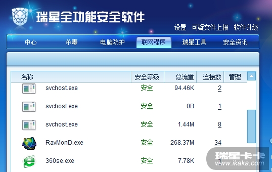 这个程序是瑞星全功能软件防火墙功能的进程,是专门监控访问网络的数据流量中是否有恶意的数据包,如果有,会直接拦截下来的,这个程序显示的流量一般等于你访问所有网络流量的总和