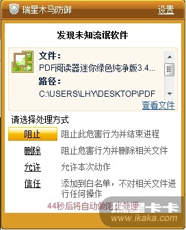 请楼主升级您的瑞星至最新版本,目前版本为23.00.29.15,测试运行您的软件没有拦截。