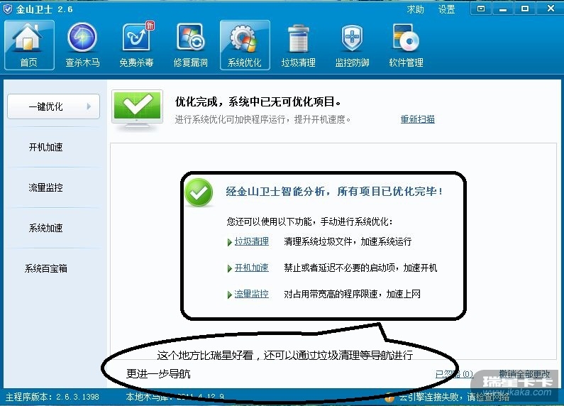 而金山 360 和 QQ 都有导航,而不像瑞星那样 全是网址,再就是开发的皮肤美观着点,真像叫花子的皮肤 很简陋 寒碜!!!