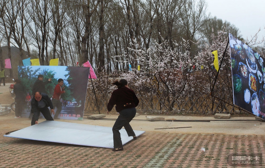 4月17日,北京出现大风沙尘天气。奥林匹克公园火炬广场大风刮起广告布缠住三位游客。