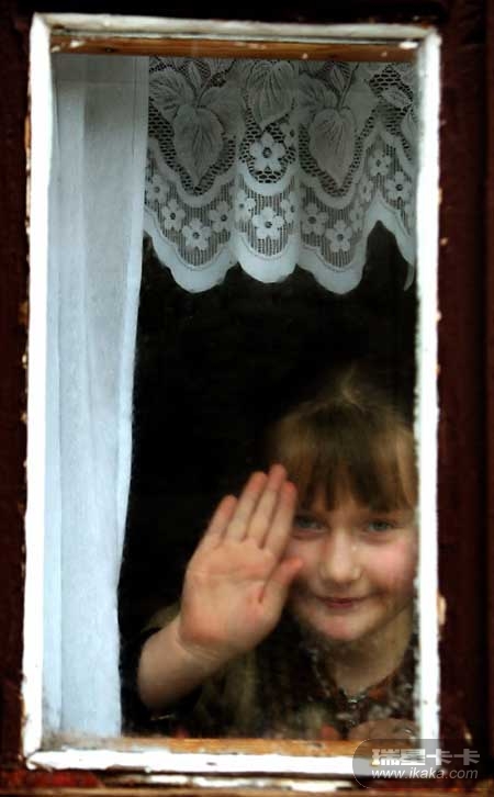 2006年3月30日,在切尔诺贝利核电站30公里隔离区内,6岁的小女孩玛丽亚从家中朝窗外挥手。玛丽亚是生活在30公里隔离区内的唯一一名儿童。
