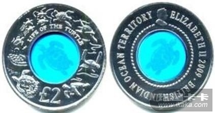 此硬币面值为2镑,由英属印度洋领地制造,特征是在固体银环中的蓝色水晶中,嵌入了一只乌龟。有人说那只安静的蓝色乌龟,实际上是只活龟。