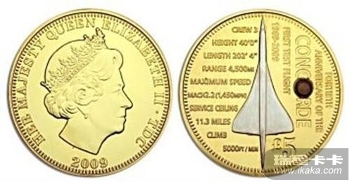 这枚硬币是为了纪念协和式飞机首航40周年,在2009年铸造的。硬币表层镀金,每面都含有一小块从协和飞机上取下的钛合金,将所有硬币收集起来,你就可以建造一架迷你型和协式飞机了。