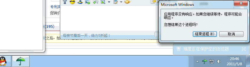 如果点了结束进程,也没有反应。要等瑞星假死结束之后,才会出现自我保护提示。