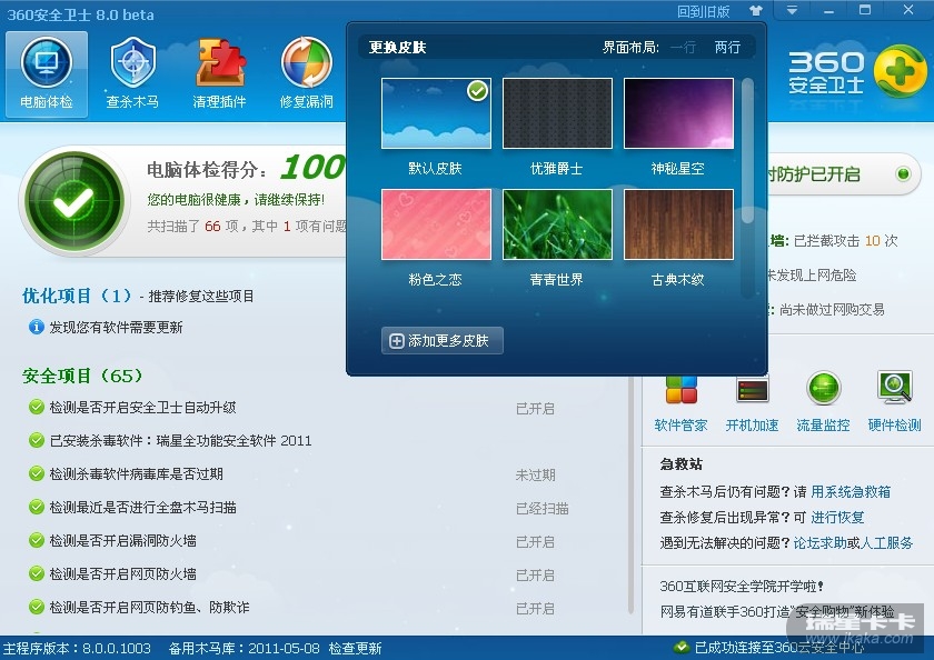 用了多年瑞星杀毒和网络防火墙,感觉还可以,就是系统资源占用多些,不过大公司软件让人放心,忍了!自从有了瑞星卡卡后,对瑞星就越来越失望,堂堂大公司,应该也是人才济济了,对付小小360,竟然用骂街的办法,实在是让人汗颜。谩骂无效后,又开始效仿,把个没什么用的卡卡助手改吧改吧搞成了瑞星助手了(而且还是在俺不知道的情况下安装的,晕了!不小心改成流氓软件了吧!),什么创意没有,就是一效仿,而且效仿的还不好,功能不全,界面不美,真想问问,这么做有意思吗?