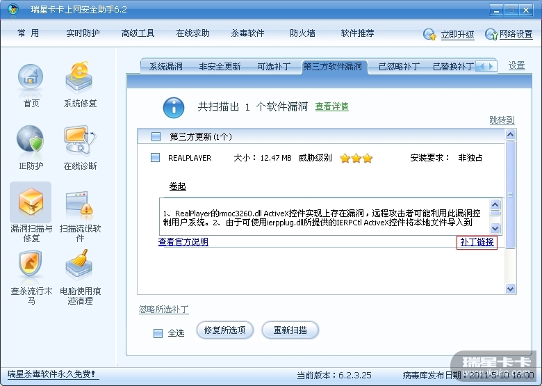 问题已经解决,自动修复无法开始下载,是现在能通过卡卡手动下载补丁安装了。但是卡卡提示此漏洞,安全助手到解决前也没有提示此漏洞。