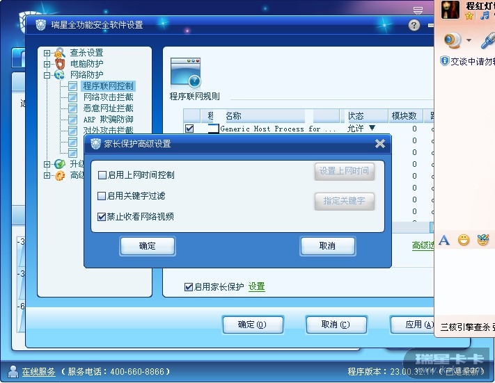 我使用的是瑞星套装,现在我在家长控制里面里面已经禁止了网络视频。
