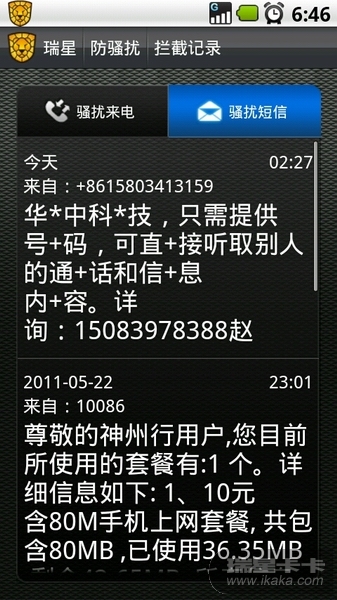 当出现拦截短信的时候,打开后台通过瑞星进入查看拦截短信,可是,进入后直接进入瑞星首页了,还要手动打开拦截记录,如果直接进入拦截记录中的“骚扰短信“就更好了。