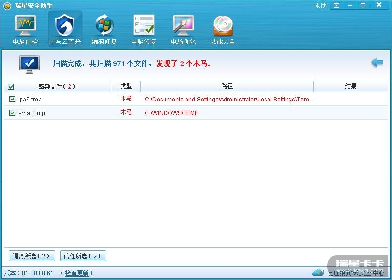 实际扫描,瑞星杀毒软件升级至最新版本可以清除掉感染