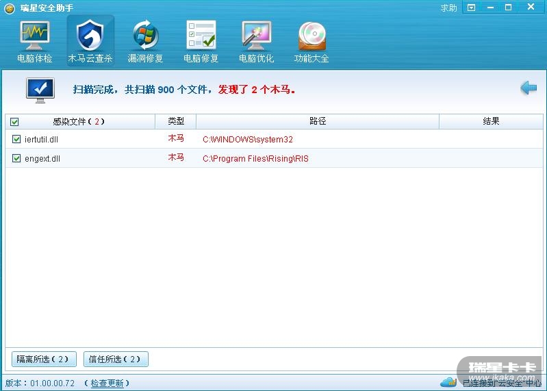 瑞星安全助手搜索到了 iertutil.dll 和 engext.dll 两个文件感染了木马,隔离后还在,杀不了;可是用了金山和360的连查都查不到!请问工程师如何解决这问题啊!!