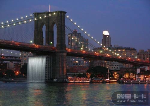 13. 建于1883年的悬浮桥——布鲁克林大桥全长1833米,横跨于东河之上,深受纽约人喜爱。从图中还可以看到名为“瀑布”的装置艺术品。