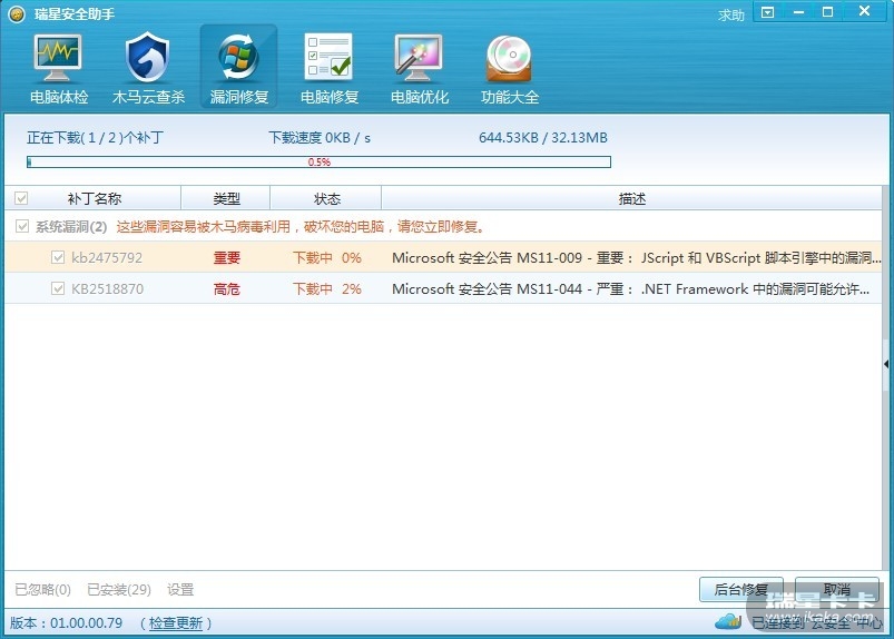 楼主使用瑞星安全助手手动下载补丁是否可以修复完成。