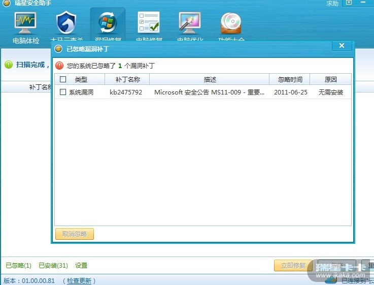 此问题请您将瑞星安全助手升级至最新版本判断。