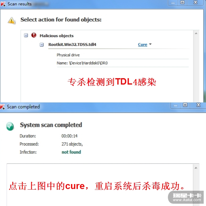 注意:对于某些TDL4 变种,卡巴斯基的这个TDSSKILLER运行一次,并不能杀灭病毒。重启后再次运行此工具,还报毒。没关系,你再重复一次杀毒操作,即可将病毒杀净。