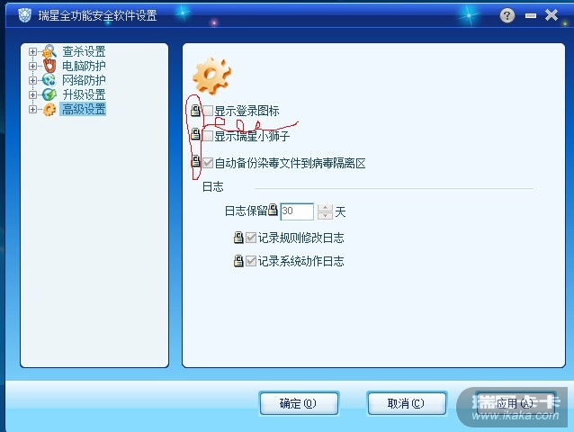 我的瑞星是3年版的,前两天我的云安全突然就关闭了,我修复了还是不行。还有高级设置里的几个选项都是有锁锁住,怎么打开?请高手帮帮忙。如图。