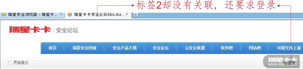 操作步骤:例如:打开瑞星安全浏览器后,打开“瑞星论坛”,登录用户。此时如点击收藏夹中的“瑞星论坛”打开一个新标签,进入后,发现用户具然没有登录。(我前面登录的论坛并没有退出,也没有关闭,)