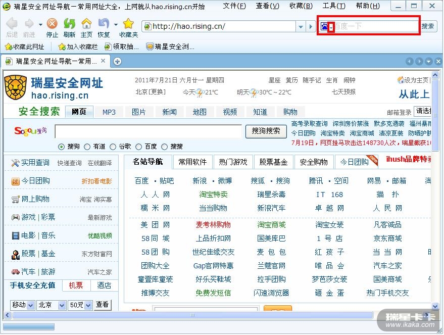 1. 打开瑞星安全浏览器,浏览器右上角搜索引擎默认为“百度”;