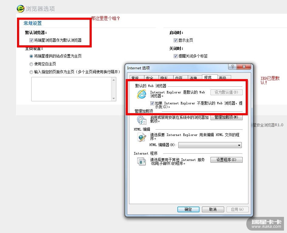 出现问题前的操作步骤:在刚安装后,询问默认浏览的事情,我选择了不再提示,然后点了取消,验证发现默认浏览器还是IE9,但是瑞星浏览器设置那里确勾着,啥回事?