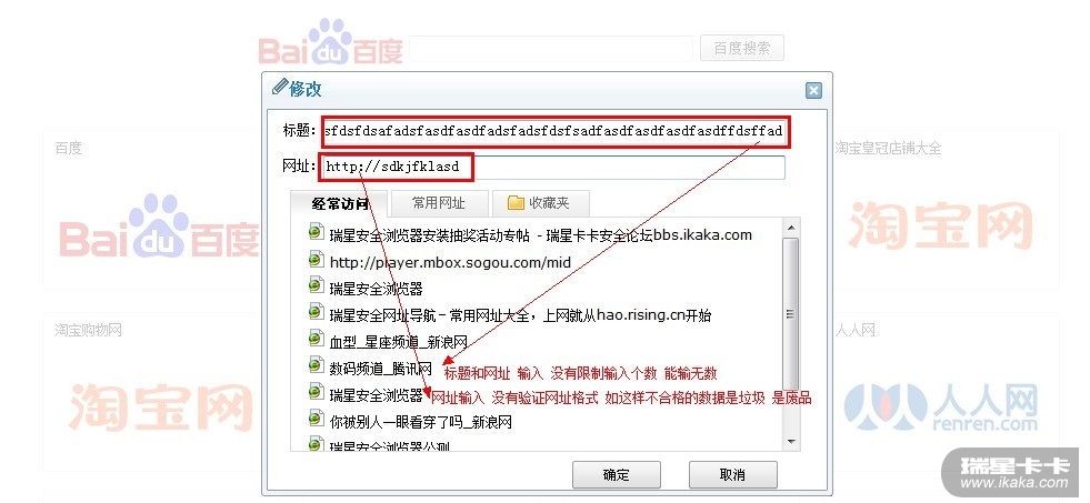 瑞星卡卡安全论坛个人产品讨论区瑞星其他产品瑞星安全浏览器 点击新建页签 re:index 选择一格 进行编辑 标题和网址没有最基本的验证