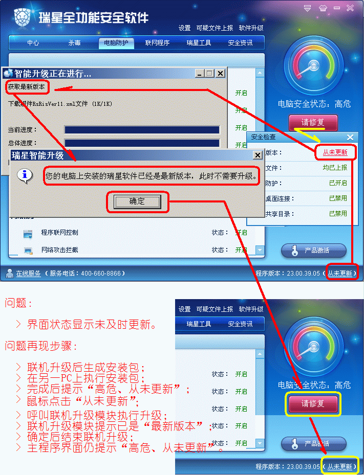生成的安装包执行后,尽管该安装包来自刚完成联机升级的另一台机器,显然已是最新版本了,但用户见主程序界面提示 “高危、从未升级” 仍按要求随即联机升级,升级模块也执行完了(提示“已是最新版本,不用升级”),用户鼠标点击 “确定” 按钮后主程序界面里有关安检状态本应同步更新,但事实上却没有更新,这显然是不正确的。