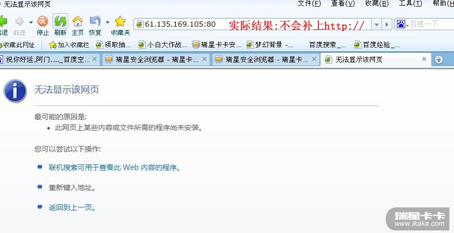 实际结果:通过输入IP(数字)访问网站的时候,瑞星浏览器的地址栏并不会补全http://,而当在地址栏中输入字母的时候,地址栏会自动补全:http://