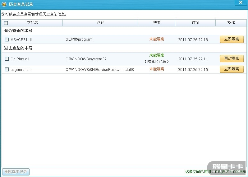 迅雷文件夹里出现木马~~可是修复是说我的隔离区满!!我该怎么办呢