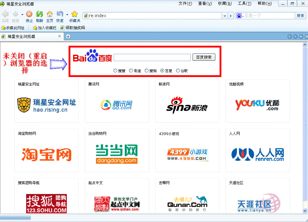 例如用户自定义re:index的搜索引擎为百度,关闭(重启)瑞星安全浏览器之后又恢复成默认的搜搜。