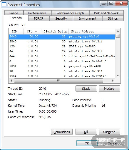 用Process Explorer分析System线程得知protreg.sys为罪魁祸首。