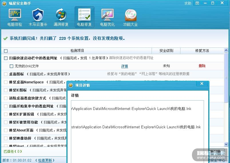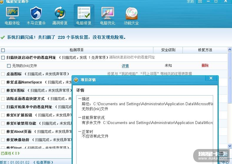 按照提示修复,一般情况是桌面快捷方式键值异常,修复就可以了。
