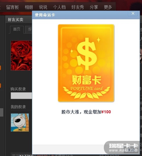 操作步骤:在玩腾讯空间的游戏“好友买卖”时点击“使用命运卡”(如图1)后弹出的界面无法关闭(如图2),只能关闭网页。(此问题只有每天第一次点击“使用命运卡”才会出现,第二次点击就正常了,)