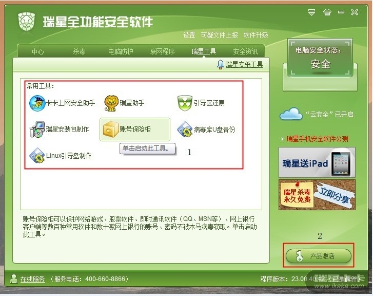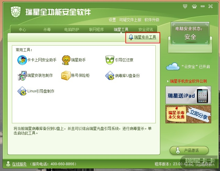 2、瑞星不是免费了嘛。建议取消“产品激活”的选项。