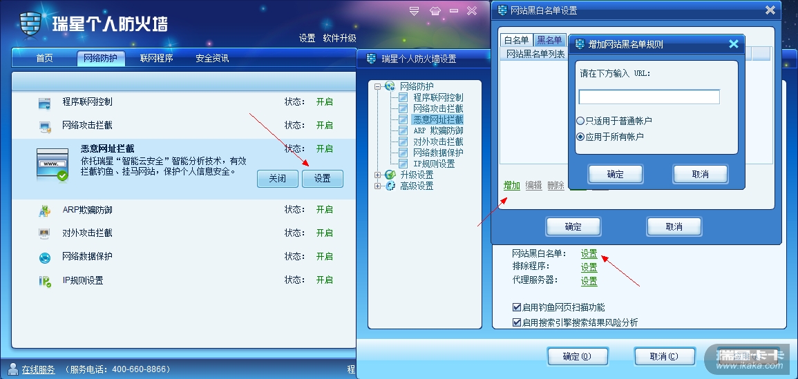在网络防护---恶意网址拦截---设置---网站黑白名单设置---将楼主要拦截的网址添加到黑名单