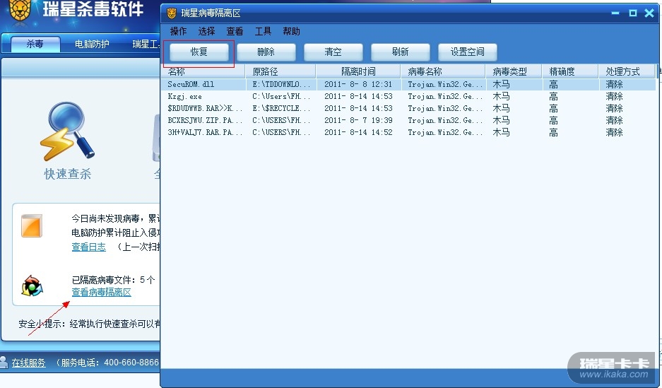 瑞星杀毒时,有时是误判所致,能否在提供病毒隔离区窗口中提供“恢复”的同时,也提供“添加信任”,像360安全卫士那样,就很方便。