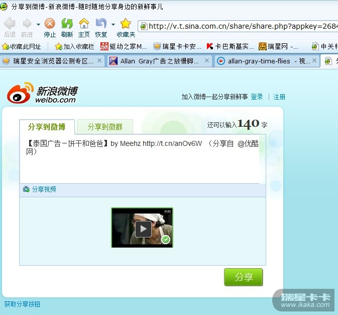 操作步骤:用瑞星浏览器将优酷的视频转发到新浪微博,此时弹出新的标签,显示的网页的内容在浏览器的最左边,点击网页中内容无反应,无法分享到微博,只有刷新网页后网页中的内容才能正常显示在页面中间,此时才能分享到微博
