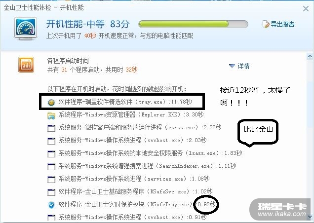建议瑞星 测试工程师 测试卡卡 启动项的 启动时间 ,若 发现 启动时间过长,请优化启动