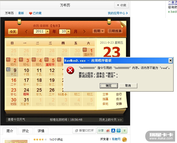 看日历报错的问题是否必现?另外,请楼主查看瑞星安装目录下是否有.dmp格式文件,如果有,请您补充上传。