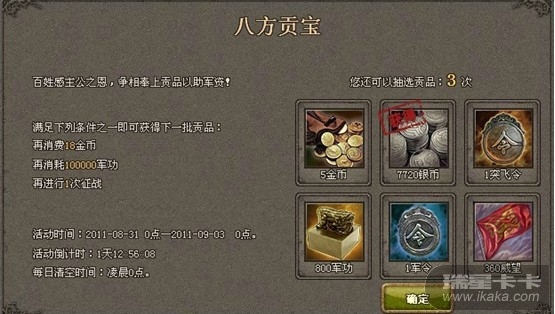活动内容:每消费一定量的金币、军功,或征战一定次数您就可以获得一批来自远方贡品。每获得一批贡品,您都能在六件中抽选其一,就会得到银币、金币、军令、军功、威望、突飞令中的一种,更有机率出加倍暴击。